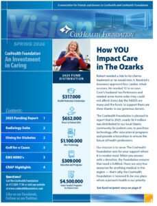 The CoxHealth Foundation gladly accepts donations to support any area of CoxHealth. You can choose to donate to a specific fund, area of care, technology, facility, health professions or just to say thank you to a care giver.