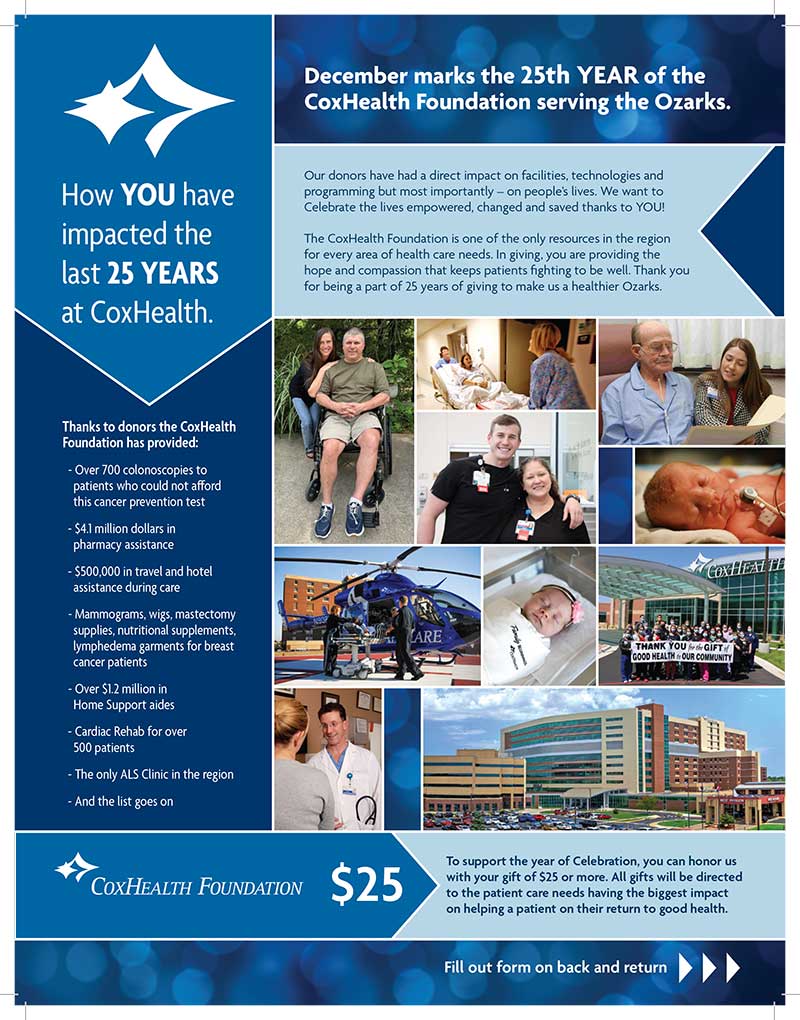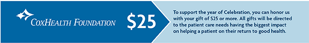 The CoxHealth Foundation is one of the only resources in the region for every area of health care needs. In giving, you are providing the hope and compassion that keeps patients fighting to be well. Thank you for being a part of 25 years of giving to make us a healthier Ozarks.